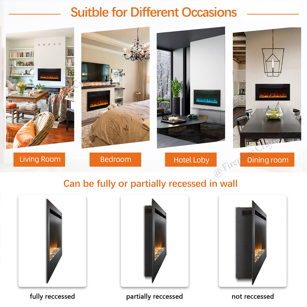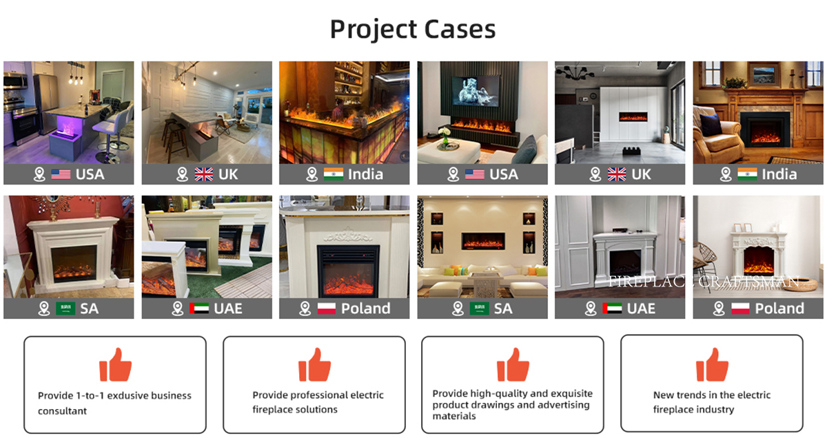 As lareiras elétricas são amplamente utilizadas em ambientes residenciais e comerciais, incluindo casas particulares, apartamentos, hotéis, lojas e empreendimentos de uso misto. Graças ao seu design "plug-and-play", a maioria das lareiras elétricas modernas pode funcionar com uma tomada elétrica padrão, sem a necessidade de conexões de gás, chaminés ou sistemas de ventilação complexos.